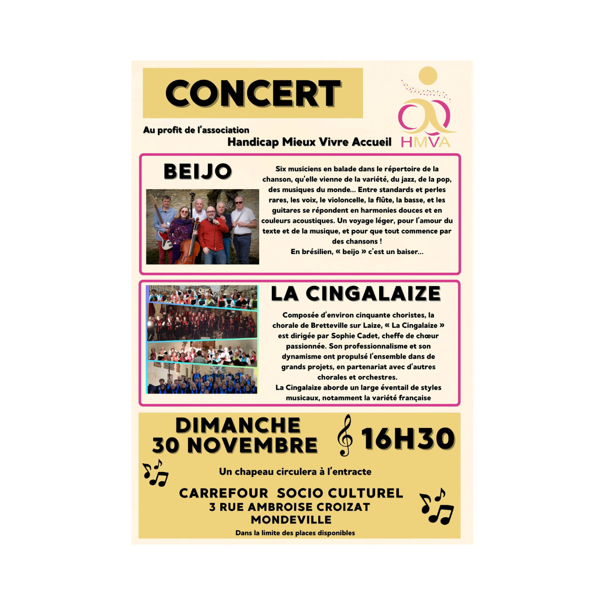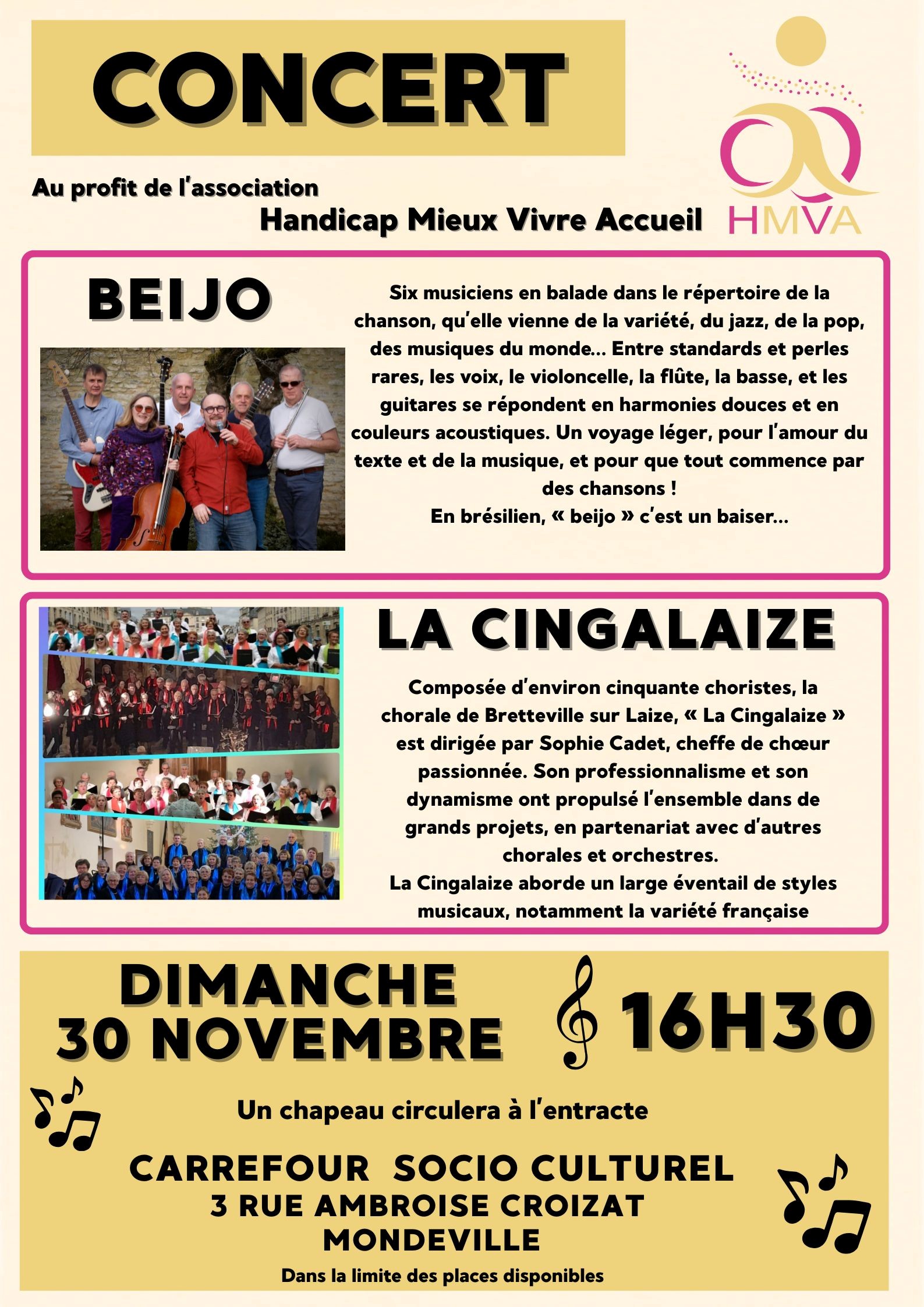 Le dimanche 30 novembre 2025 à 16h30, à Mondeville (14), deux ensembles musicaux se réunissent pour un concert au profit de l’association Handicap Mieux Vivre Accueil (HMVA).
