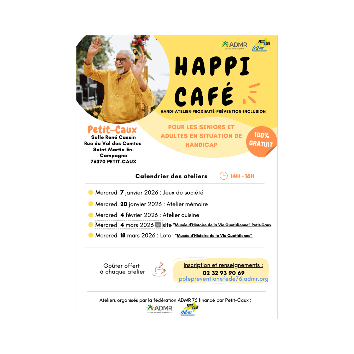 Le dispositif « Happi Café » est destiné aux adultes en situation de handicap ainsi qu’aux seniors résidant à Petit-Caux et dans les communes limitrophes. Il est organisé par la Fédération ADMR de Seine-Maritime et financé par la Communauté de communes de Petit-Caux.