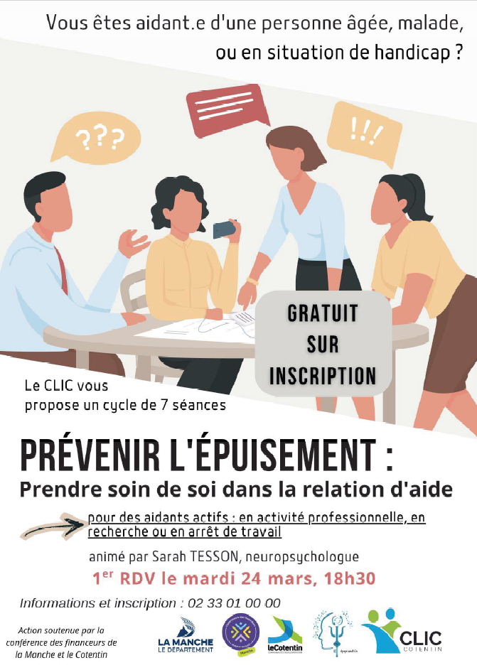 Le CLIC du Cotentin, avec plusieurs partenaires, propose une formation intitulée « Prévenir l’épuisement : prendre soin de soi dans la relation d’aide », animée par Sarah TESSON, neuropsychologue.