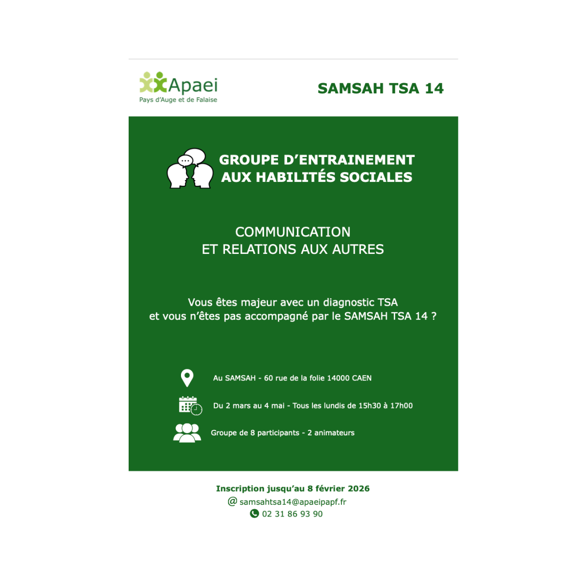 Organisé par le SAMSAH TSA 14 de l’APAEI Pays d’Auge et de Falaise, ce groupe s’adresse aux personnes majeures avec un diagnostic de trouble du spectre de l’autisme, non accompagnées par le SAMSAH TSA 14.