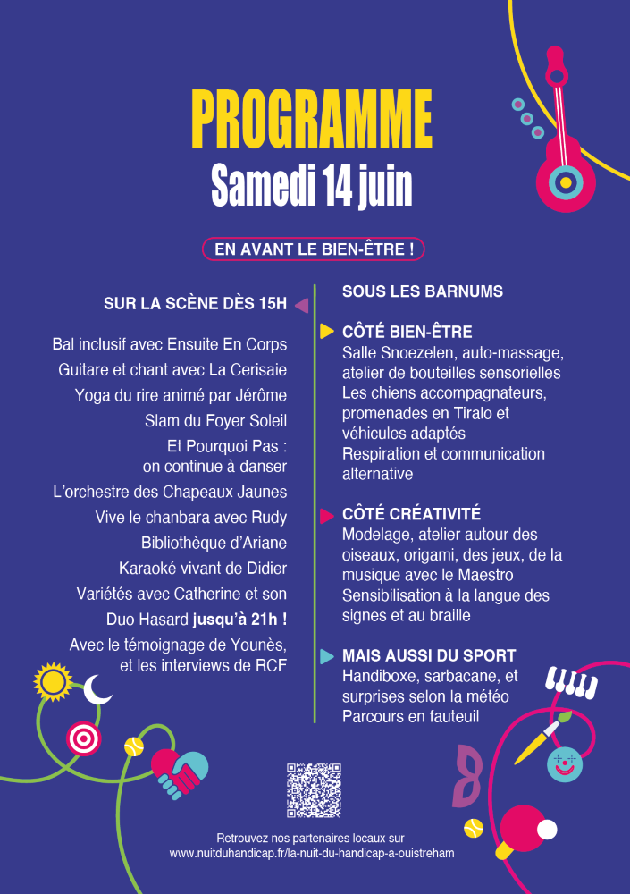• sur la scène à partir de 15h : bal inclusif, guitare et chant, yoga du rire, slam, danse, orchestre, chanbara, bibliothèque, karaoké, témoignage et interviews.