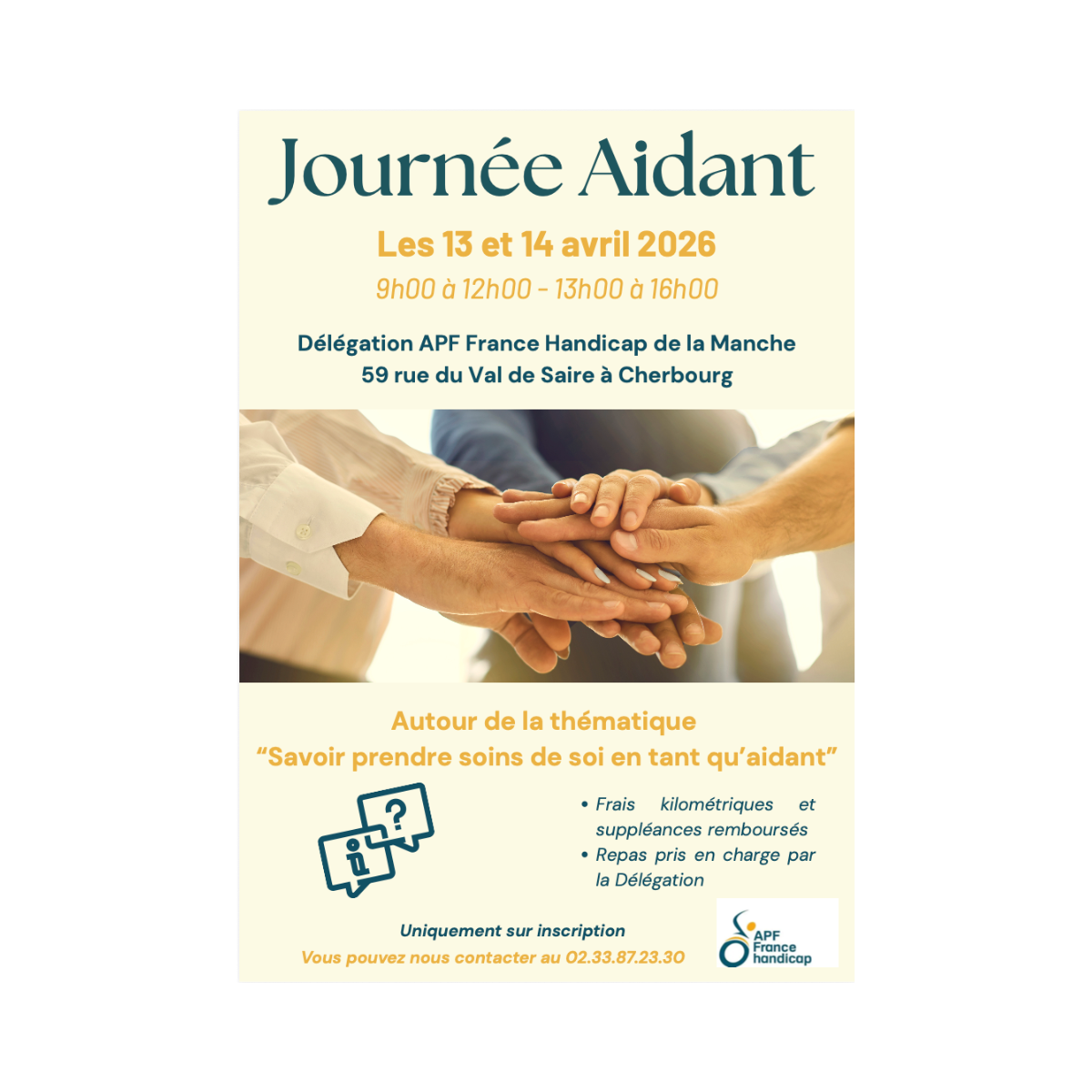 La délégation APF France Handicap de la Manche propose deux journées de formation à destination des aidants les 13 et 14 avril 2026. Les sessions se dérouleront de 9h00 à 12h00 et de 13h00 à 16h00 dans les locaux de la délégation situés au 59 rue du Val de Saire, à Cherbourg.