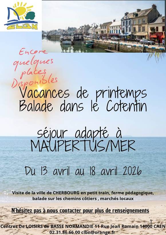 Le Centre de Loisirs Basse-Normandie (5CLBN) propose un séjour du 13 au 18 avril 2026 à Maupertus-sur-Mer (50).