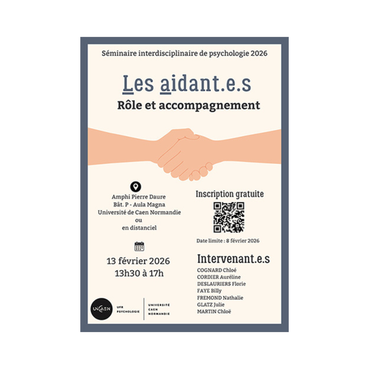 Le vendredi 13 février 2026, de 13h30 à 17h00, ce séminaire se tiendra en présentiel dans l’amphithéâtre Pierre Daure de l’université de Caen (campus 1) ou en distanciel. Il proposera une approche pluridisciplinaire de l’aidance à travers plusieurs interventions en psychologie clinique, neuropsychologie, psychologie du développement, de l’éducation et sociale, ainsi qu’une table ronde. L’événement est obligatoire pour les étudiant(e)s en master de psychologie et ouvert aux professionnel(le)s. Une attestation de présence pourra être délivrée sur demande.