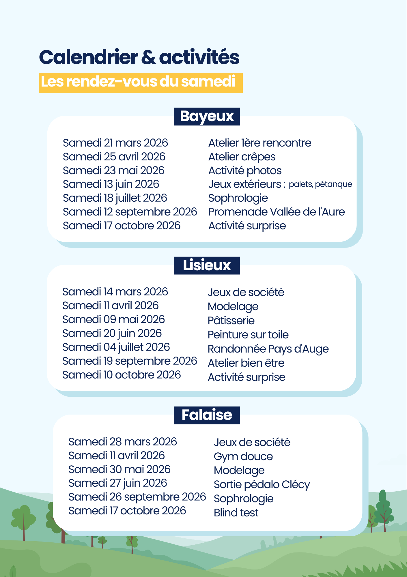 Les après-midis répit ont lieu un samedi par mois, de 14h à 17h et sont gratuites. Elles sont proposées sur trois territoires du Calvados : Falaise, Lisieux et Bayeux.