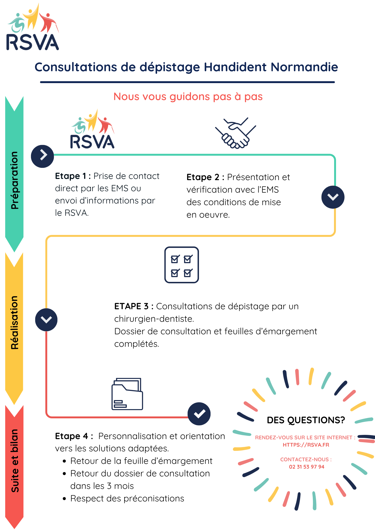 Un chirurgien-dentiste, salarié du RSVA, se déplace sur place afin d’éviter le déplacement des personnes. Ces consultations permettent d’effectuer des bilans bucco-dentaires et, si nécessaire, d’élaborer un plan de traitement avec une orientation vers la solution de soins la plus adaptée à la situation de handicap.
